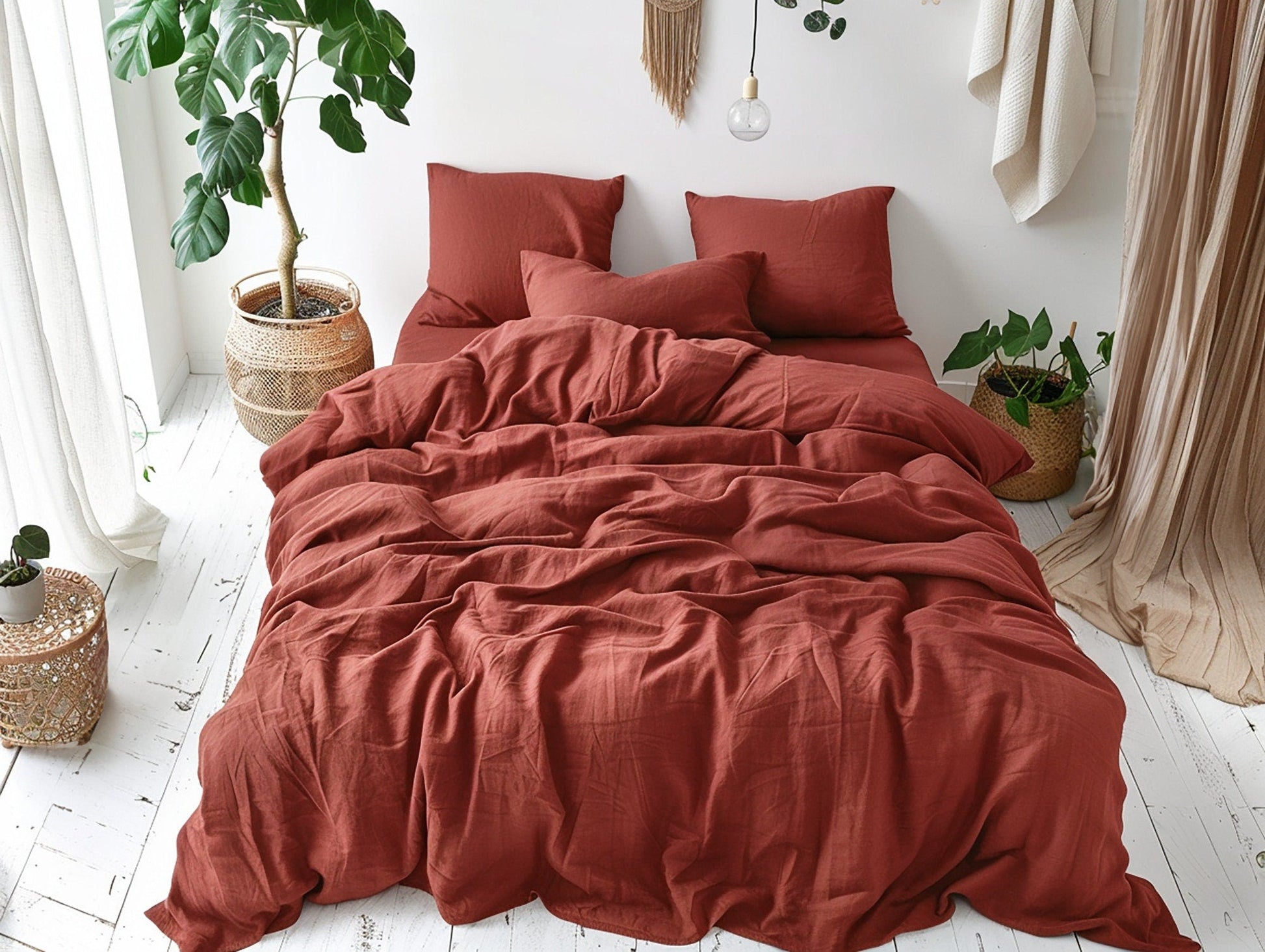 Get ready for a cozy night's rest with our set of 2 Redwood linen pillowcases, available in Queen, Super Standard, King, and Standard sizes. Crafted from high-quality custom linen, these pillowcases are designed to provide total comfort and luxury. With an envelope closure, our linen pillowcases keep your pillows securely in place while you sleep. The red brown color of the linen adds a rustic touch to your bedding, making it perfect for farmhouse or vintage styles. If you love the earthy and warm tones of rust and terracotta, this pillow set will be right up your alley. These pillowcases are versatile enough to complement any decor. Mix and match them with different colors and textures to create a truly unique bedroom. Add a maroon linen pillowcase or a euro pillow sham for a subtle pop of color. Get your set of Redwood linen pillowcases today and experience ultimate pillow luxury!